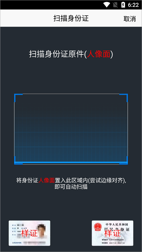 7、根据系统提示将身份证正方面置入图示区域内,即可自动扫描,完成后提交即可,等待银行那边确认审批,身份信息即可更新成功
