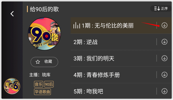点击右边的下载按钮,还可以直接将自己喜欢的歌曲下载,如果觉得这个频道自己经常会听,你可以直接点击收藏,以后可以直接打开。