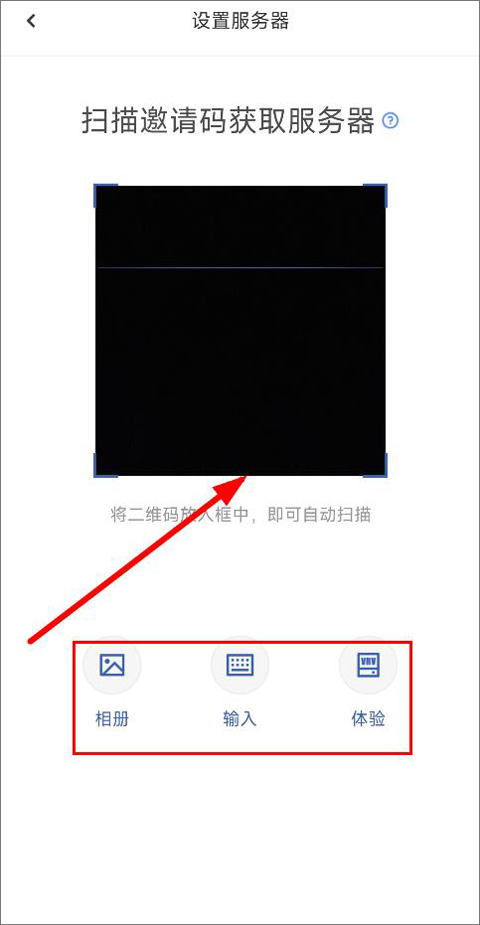 2、进入设置服务器页面,用户需要扫描邀请码获取服务器,也可以选择拍照、相册扫描、文字输入等方式;
