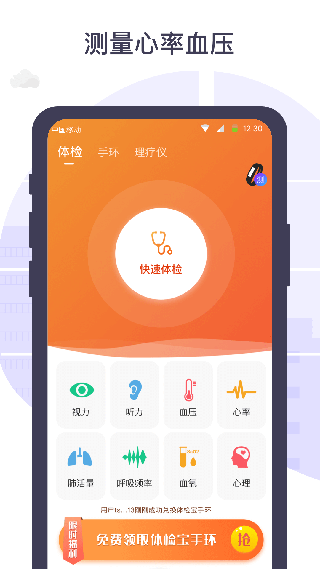 体检宝测血压心率app是一款医疗身体检查软件,全称体检宝手机测血压视力心率app,通过手机测量、可穿戴设备来收集和汇总用户的健康信息,为其提供个性化的健康解决方案(饮食、运动)和健康风险评估,为存在健康隐患的用户接入第三方服务。并且拥有测量你的血压、视力、心率等功能,随时随地监护你的身体状态,让你更加的健康,让你更加的安心。除此之外,体检宝测血压视力心率软件还能进行视力检测、听力检测、血压检测、心率检测、肺活量测量、呼吸频率测量、血氧测量、心理检测等服务,操作过程简单方便,使用手机蓝牙连接智能设备即可进行一系列健康检测,这里可以自动为您保存检测的健康数据信息,为用户提供了精准的健康风险评估,实时对检测的健康数据进行风险评估,有需要的朋友不妨免费下载尝试!