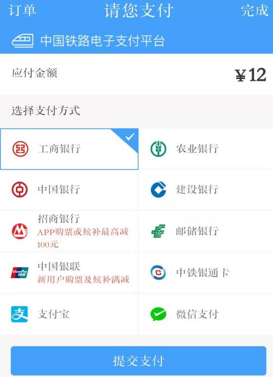 4.核对乘车信息无误后,点击立即支付,目前12306支持以下支付方式。付清票款后即可。