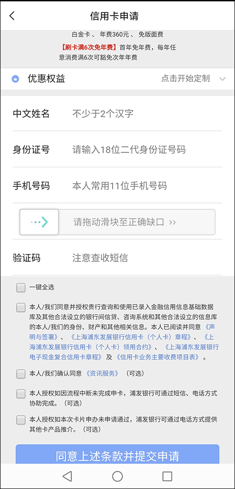 3、在具体信用卡申请界面中,用户需要填写好中文姓名、身份证号、手机号码、滑动验证码、输入短信验证码;