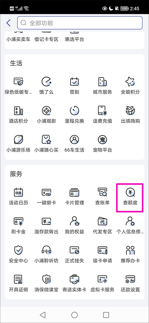 2、然后,在更多界面中的服务一栏中找到并点击“查额度”选项;