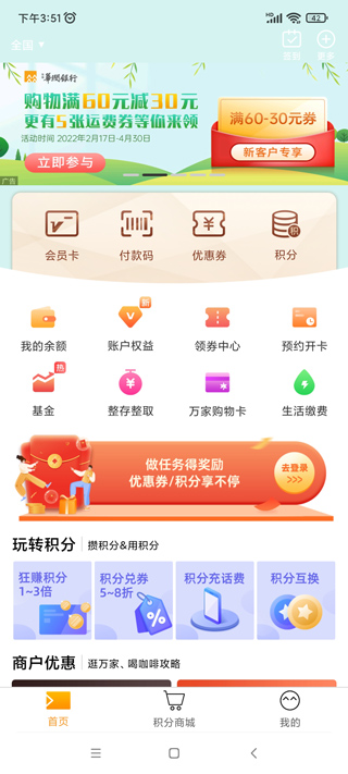 2、进入软件,在首页,有会员卡、付款码、优惠券、积分等,下方还可以查看余额、账户权益‘基金等;
