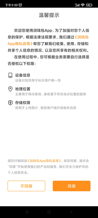 1、在本站下载安装华润银行润钱包app,运行软件,同意协议;