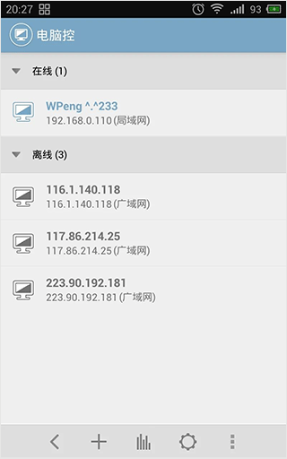 手机会自动搜索出局域网内打开了电脑端軟件的电脑。并显示在在线列表中,如果没能搜索出电脑,屏幕下方的添加按钮,手动添加。