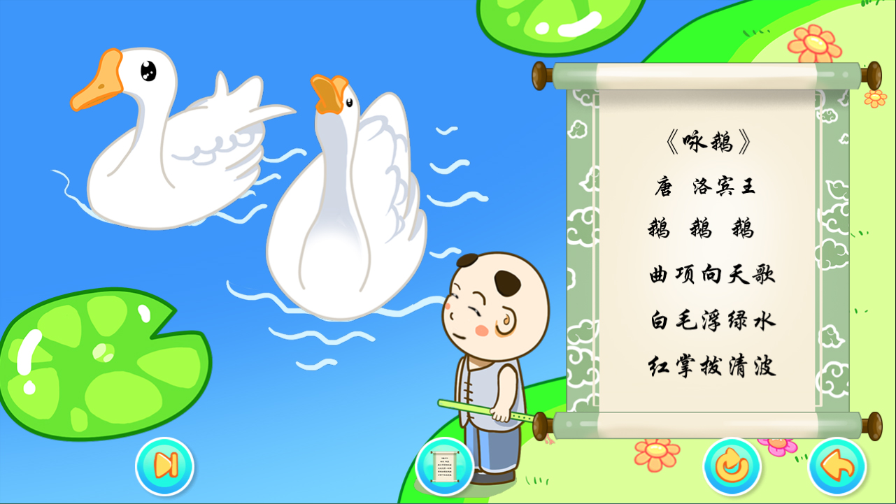 3、比如这首咏鹅,在画面的左下角可以点击下一首,右下角则是重读和返回主界面