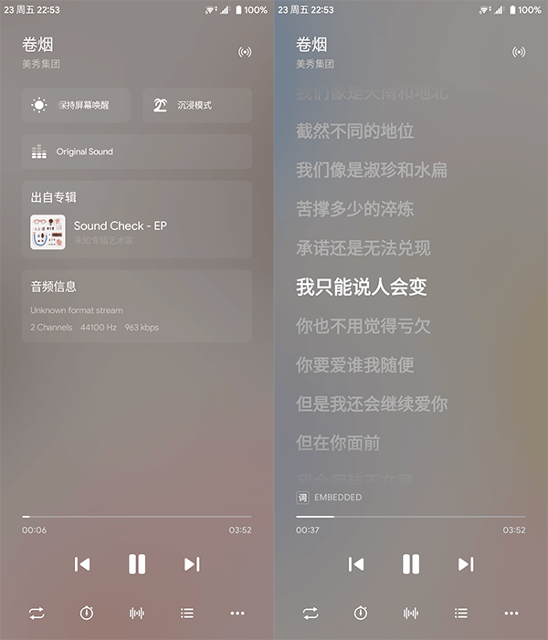 在专辑和上下空白的区域左滑,可以浏览更多歌曲信息并进行一些简单的设置,右滑则是来到动态歌词界面。而说到动态歌词界面,椒盐音乐又可以斩获我颁发的「Android 平台最好看的音乐歌词界面」大奖。