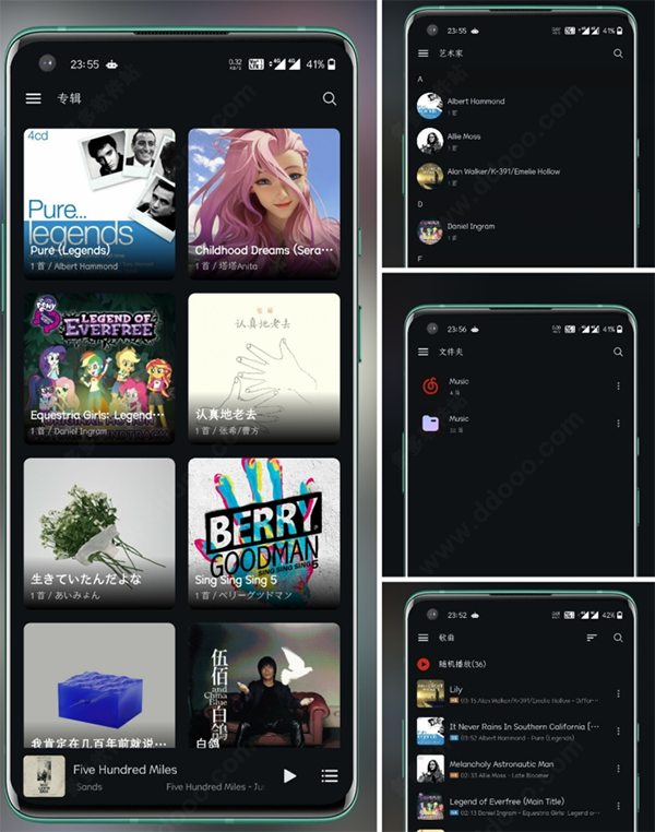 2、打开应用你就能看到你的歌曲,不会有任何多余的操做,除了开屏歌单以外,你可以选择开屏以专辑,以艺术家,还有文件夹的方式呈现在你的眼前,在歌曲list界面还会显示歌曲的一些信息,例如歌曲的品质,如果你的歌曲是高解析度音频,会出现Hi-Res小金标