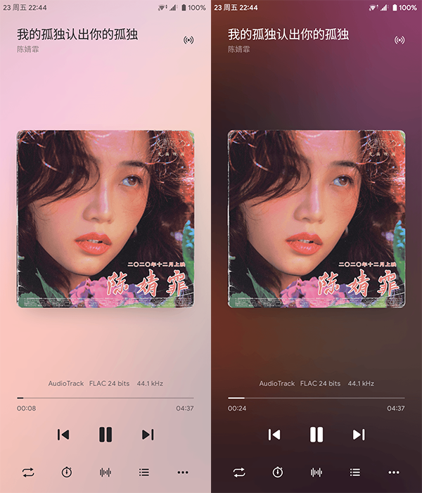 3、再来看看听歌界面,歌曲界面由两部分组成,一面是专辑封面一面是歌词,这两面让你在听歌时不会觉得很单调。在专辑那一面会显示歌曲的格式类型和码率,对于音乐发烧友来说这项功能还是很特殊的。歌曲播放时的界面为,高斯模糊的流光,可以在设置里设置流光的效果,例如主题和流光效果的强弱。