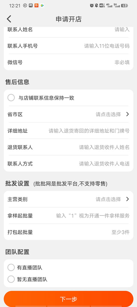 3、输入详细信息,如店名、号码、联系人、售后信息、批发设置、团队配置等等,然后点击下一步,等待审核通过即可。