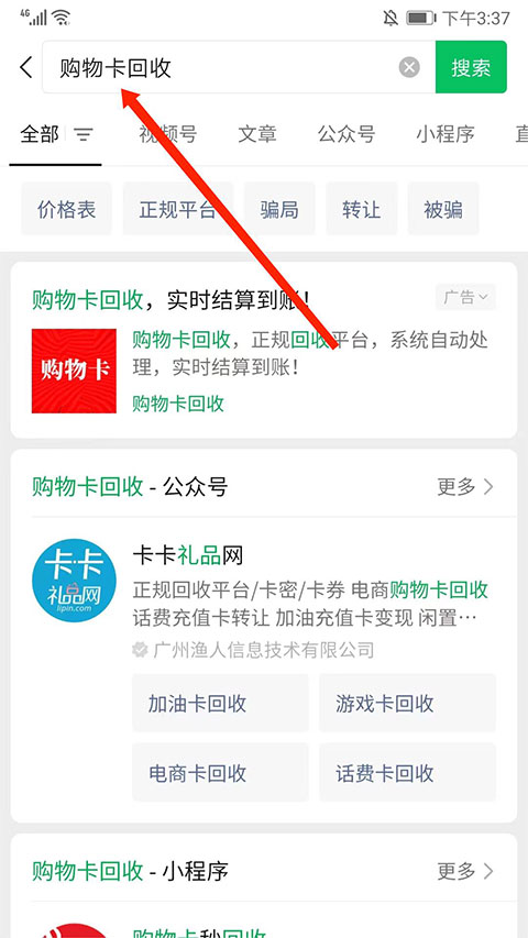 1、打开微信,输入“购物卡回收”,然后选择需要的回收平台,