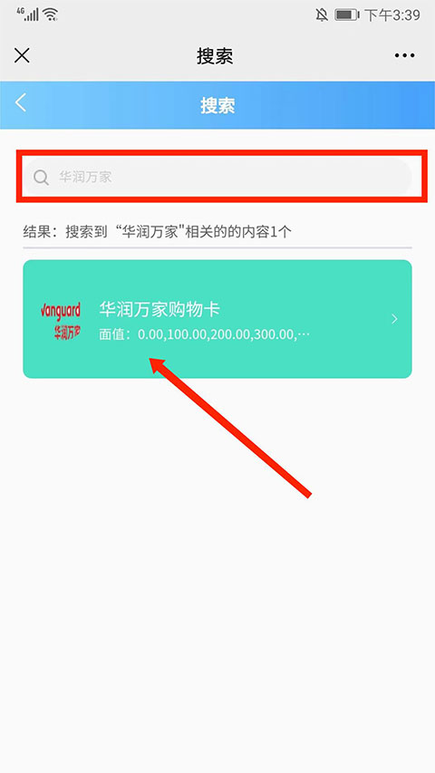 2、在小程序“搜索框”输入“华润万家购物卡”,然后点击卡片,