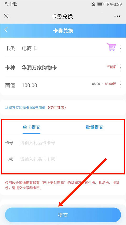 4、确认好面值后填写“卡号”和“卡密”,最后选择下方“提交”即可回收购物卡。