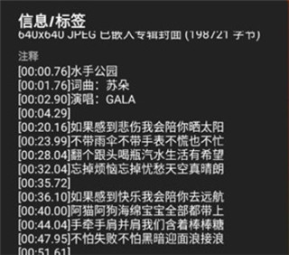 2、当然了还有一种方法可以支持手动添加歌词,那就是运用歌曲标签。同样的点击菜单,点击【信息/标签】,在标签中将歌词复制进去,这样就能显示歌词了。