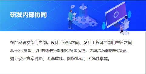 在产品研发部门内部,设计工程师之间、设计工程师与部门主管之间基于3D模型、2D图纸进行频繁的技术沟通,尤其是跨地域的沟通,如:设计方案讨论、图纸审批、图纸管理、图纸共享等。