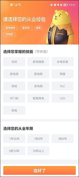1、对于刚刚使用该软件的电工师傅,可以选择你的专属领域技能还有你的行业年龄,这样系统能够分配更合适你的订单。
