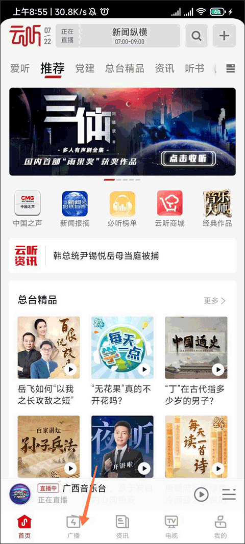 首先我们进入app,在底部找到广播,点击进去到广播界面