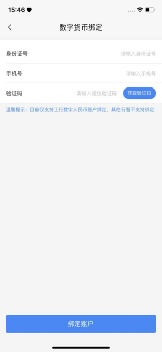 3、手机号输入框需要输入绑定且已开通工行数字人民币的手机号(1.未绑定工行手机号不可成功绑定账户,2.绑定工行,未开通数字货币手机号不可成功绑定账户,3.已经和APP绑定数字货币的手机号不可再次进行绑定)