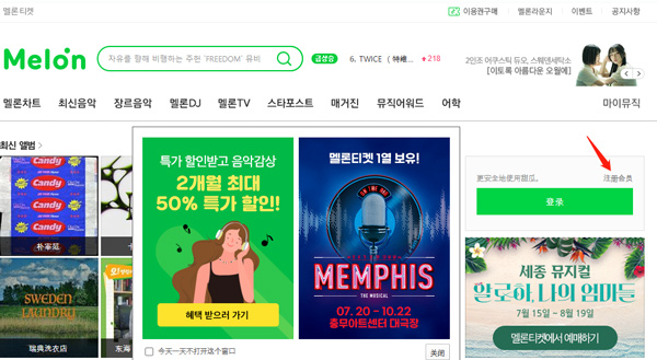 1、首先在浏览器上搜索melon网页版,点进浏览器上的第一个网页,这边我用了浏览器的翻译功能,把页面翻译成中文了,接下来点击注册会员。