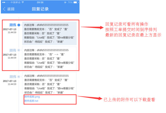 点击回复记录,可看每次工单操作的记录与回复内容,包括每条回复记录的附件,都可清晰的查看到。