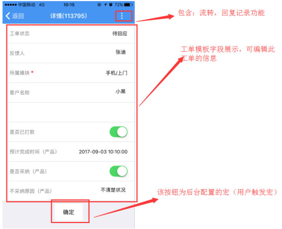 每个工单下的详情,显示的为该工单的模板字段;后台配置哪些字段可编辑、可见,宏的显示与隐藏,根据后台的配置完美展示(参考帮我吧后台工单相关设置)。
