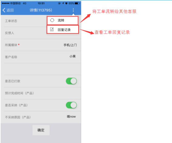 当工单需要流转给其他部门、其他客服时,可以在工单详情页面的右上角,点击按钮展开,显示出流转、回复记录跳转链接,点击流转可跳到另一个界面,选择客服,填写回复记录、添加附件,可选择抄送人,选择是公开回复或内部注释。提交后就流转成功,对方将会收到通知,处理工单。