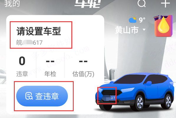 4、回到车轮查违章APP首页就可以看到已经绑定了该骑车了,点击查违章按钮。