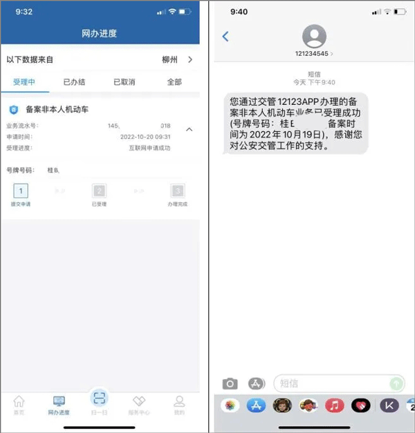 6、备案申请提交后,网办中心工作人员将在一个工作日内对备案信息审核确认,审核通过后,系统会将审核结果通过短信或“交管12123”APP消息发送给备案用户和车主。
