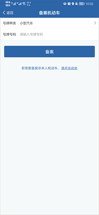 2、然后输入车牌号码并点击备案即可备案机动车,若需要备案非本人机动车时,点击此处