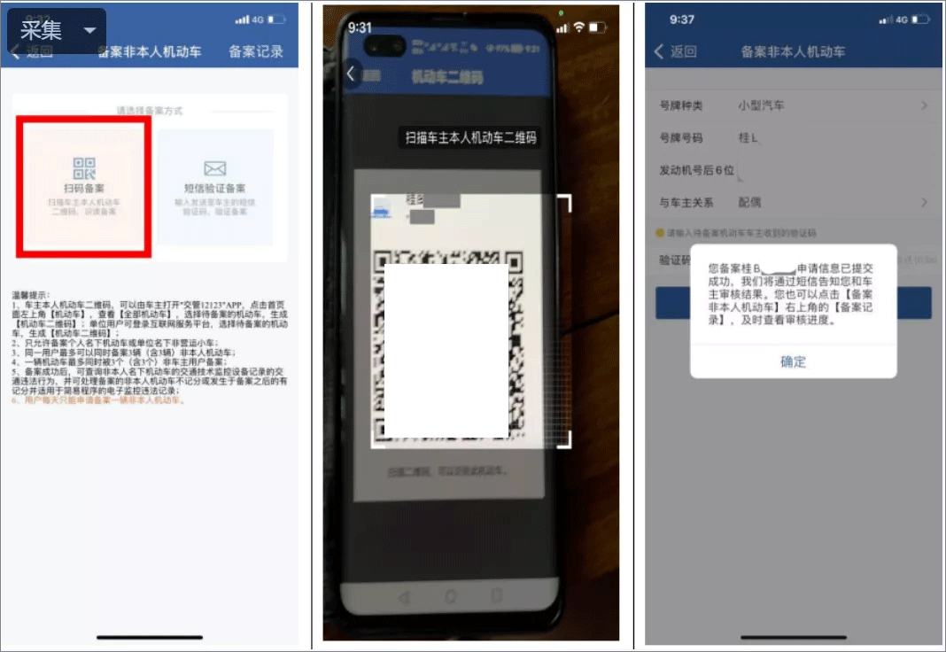 5、采用“短信验证备案”的,用户输入需要备案的非本人机动车的号牌种类、号牌号码、发动机号后六位等信息后,系统将发送短信验证码至车主手机号码(车主可以是非互联网平台注册用户),申请用户输入车主收到短信验证码。短信验证码验证通过后,选择与车主关系,提交备案申请。