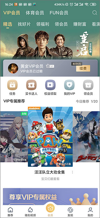 2、然后会看到推荐、随刻视频、会员、发现、我的五个板块,在推荐中有着大量的电视剧供用户观看,并且累计签到还能免费领会员哦!