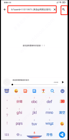 2、然后回到五音助手app中,点击“链接解析”,接着将链接直接粘贴到输入框中,然后点击搜索按键;