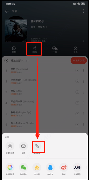1、到想要下载的歌曲或专辑页面中点击“分享”——“复制链接”;