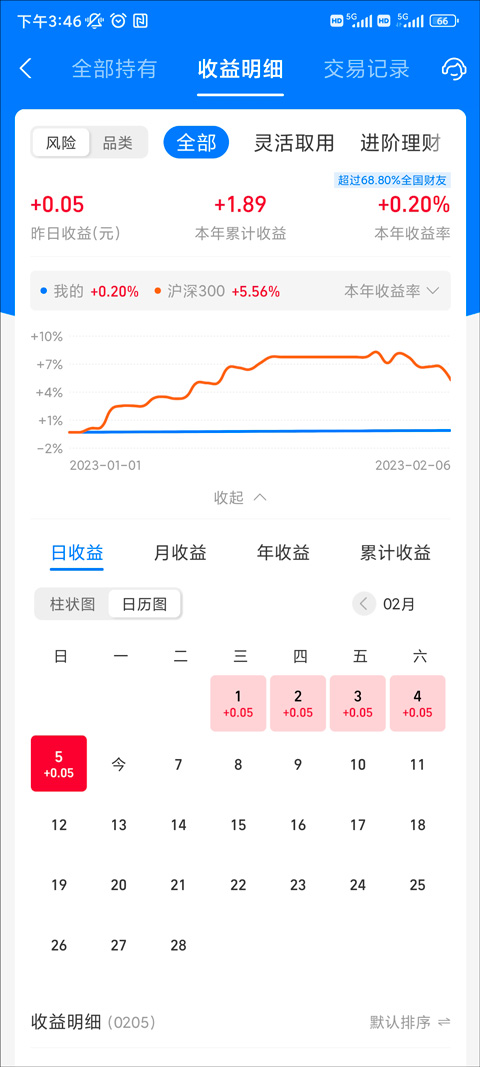 4、点击收益明细,在日收益中点击日日历图,即可查看收益日历图。