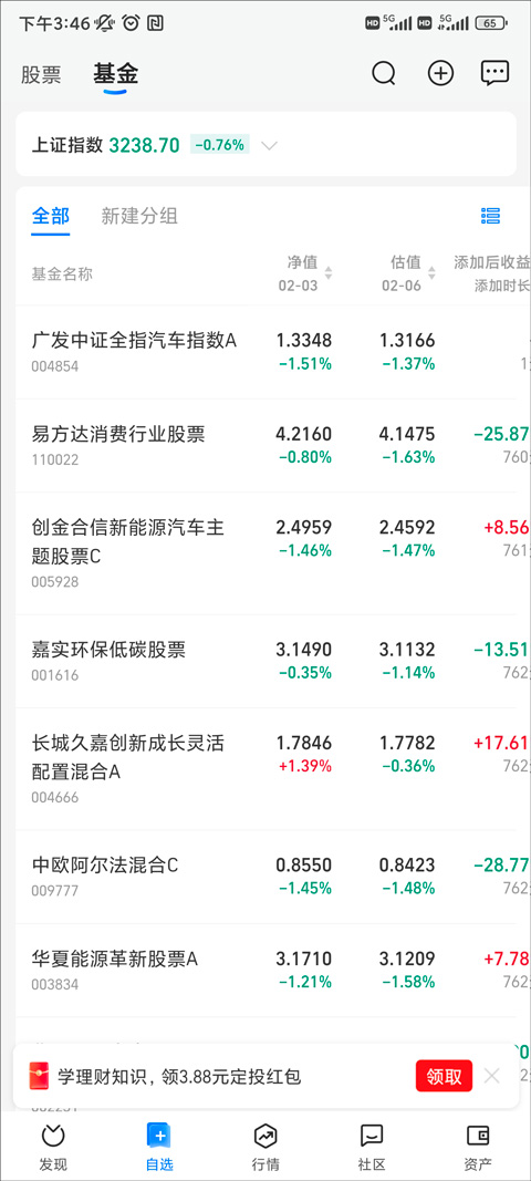 2、点击“基金”,进入基金页面以后就可以看到自己持有的基金,这时就可以查看基金的收益。