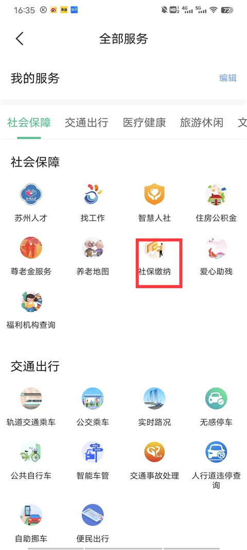 2、在社会保障、交通出行、智慧人社、住房公积等等功能中找到社会保障服务,点击社保缴费;