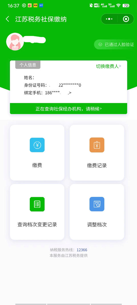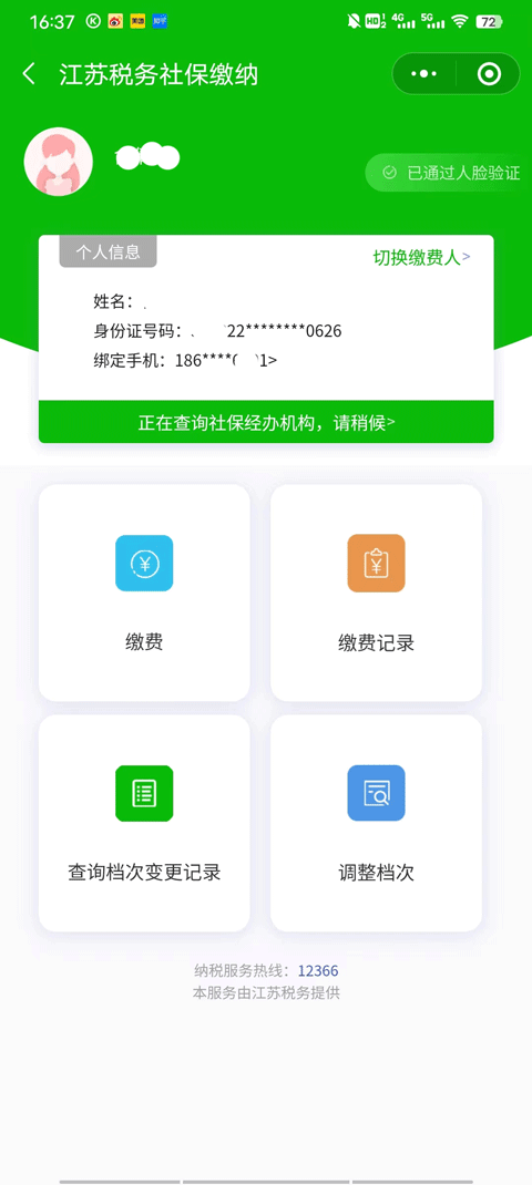 3、之后会转跳到江苏税务社保缴纳系统中,实名认证后,点击缴费记录,如果你是帮别人查询的话也可以点击切换缴费人;