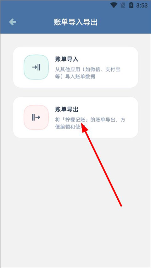 3、进入账单导入导出页面,用户可以选择从其他应用导入账单数据,也可将软件记录的数据导出;