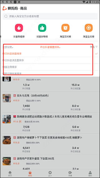 1、进入软件即可看到商品榜单、达人榜单、抖音直播实时榜单、商品榜单等各种数据;