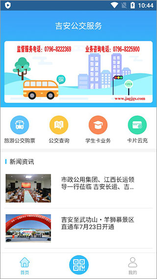 1、打开吉安公交服务app,首页如下图所示,包含了旅游公交购票、公交查询、学生卡业务等;