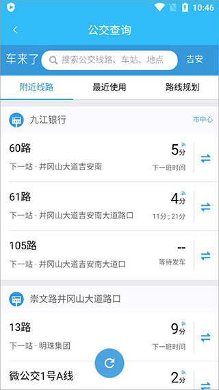 2、点击公交查询,支持输入车号,或者查看最近使用线路;