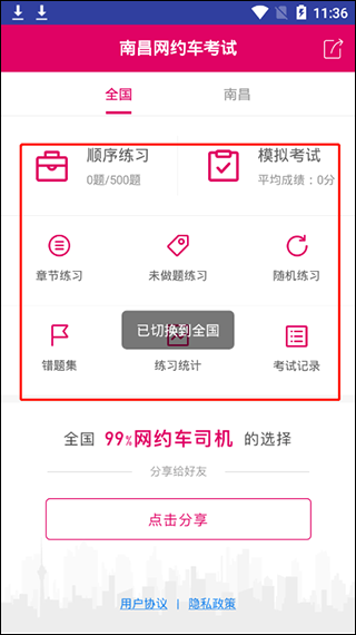 1、下载安装好本站提供的南昌网约车考试安卓版软件后即可运行,其中提供了全国和南昌的题库;