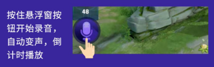 开启悬浮窗,按住悬浮窗按钮开始录音,即可自动倒计时播放变声后的声音,打开游戏麦克风,即可和队友畅聊,助你称霸峡谷和吃鸡!