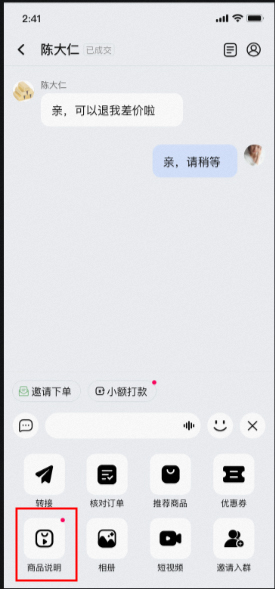 3、在订单管理方面,app对客户的订单可以进行多样化的精细管理,例如在与客户进行商品沟通时可以点击【商品说明】,选择对应的商品,点击发送视频即可,这极大地方便与客户沟通