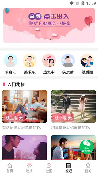 2、登录成功后进入软件首界面,可以看到有非常多不同类型的搭讪技巧,用户可根据不同时期作为参考;