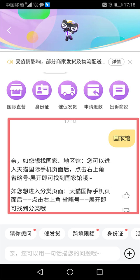 但是可以在天猫国际app首页中的顶部搜索框中输入“国家馆”,输入的同时用户可以看到其下拉选项中有部分国家馆的旗舰店之类的选项目,用户可以选择一个点击进去即可