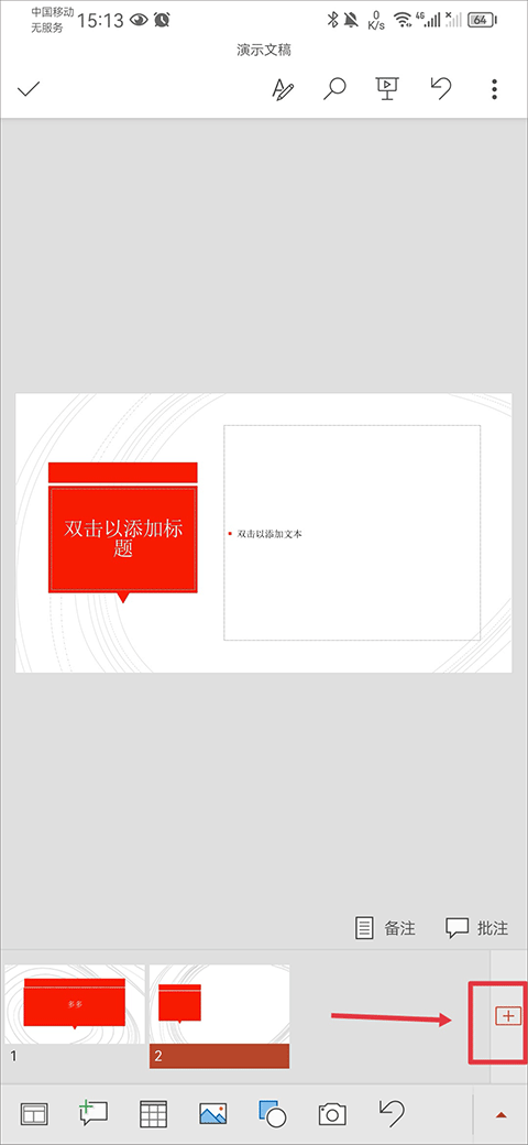 在下方文稿演示栏中点击右边的+号按钮即可增加一个空白页面