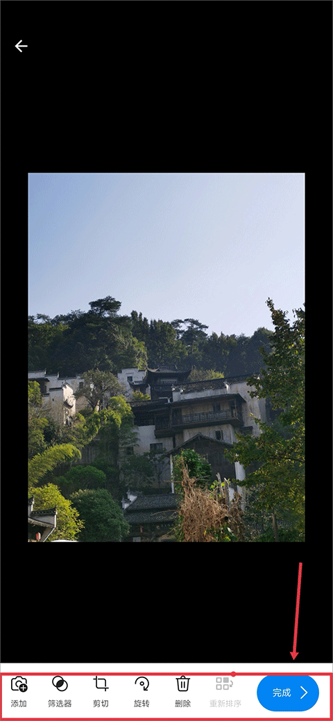 2、点击后会进入手机图库,选择设置背景的图片并点击完成,若需要编辑该图片还可以使用工具再次进行编辑