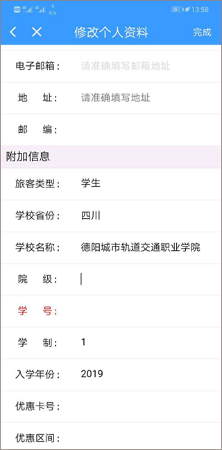 3、找到【附加信息】选项,点击右上角【修改】,在学生类型中选择【学生】,然后按要求添加学校省份、学校名称、院级、学号、优惠区间(优惠区间要写学生证上填写的优惠区间)等即可。